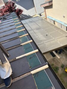 今回、トタン屋根のカバー工事をご依頼頂き工事の方をさせて頂きました。軒先部分の下地が腐食していたので軒先部分は解体していきます。解体後に新しい下地を新設します。加工した板金を被せて施工完了になります。